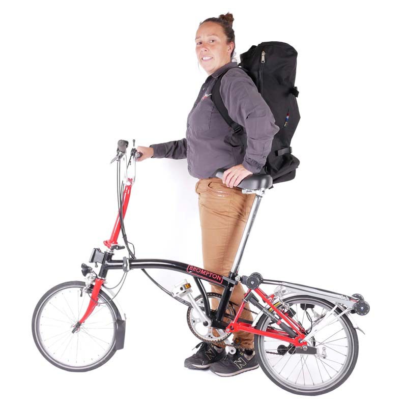Achtung! Hast du einen teleskopischen oder verlängerten Sattelstütze an deinem Brompton? Überprüfe vor dem Kauf des Rucksacks, ob die Länge bis zur Oberkante deines Sattels nicht höher als 60 cm ist (wenn das Fahrrad zusammengeklappt ist). Dies ist die maximale Höhe, die der Rucksack derzeit aufnehmen kann.