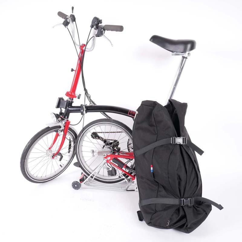 Ihr Brompton kann vollständig in diesem Rucksack aufbewahrt werden. Nach dem Öffnen des langen Reißverschlusses können Sie Ihr Brompton hineinstecken. Durch Schließen des Reißverschlusses und der Schnallen ist der Rucksack gebrauchsfertig. In einigen Ländern ist es obligatorisch, Ihr Faltrad in einer Tasche im öffentlichen Verkehr aufzubewahren.