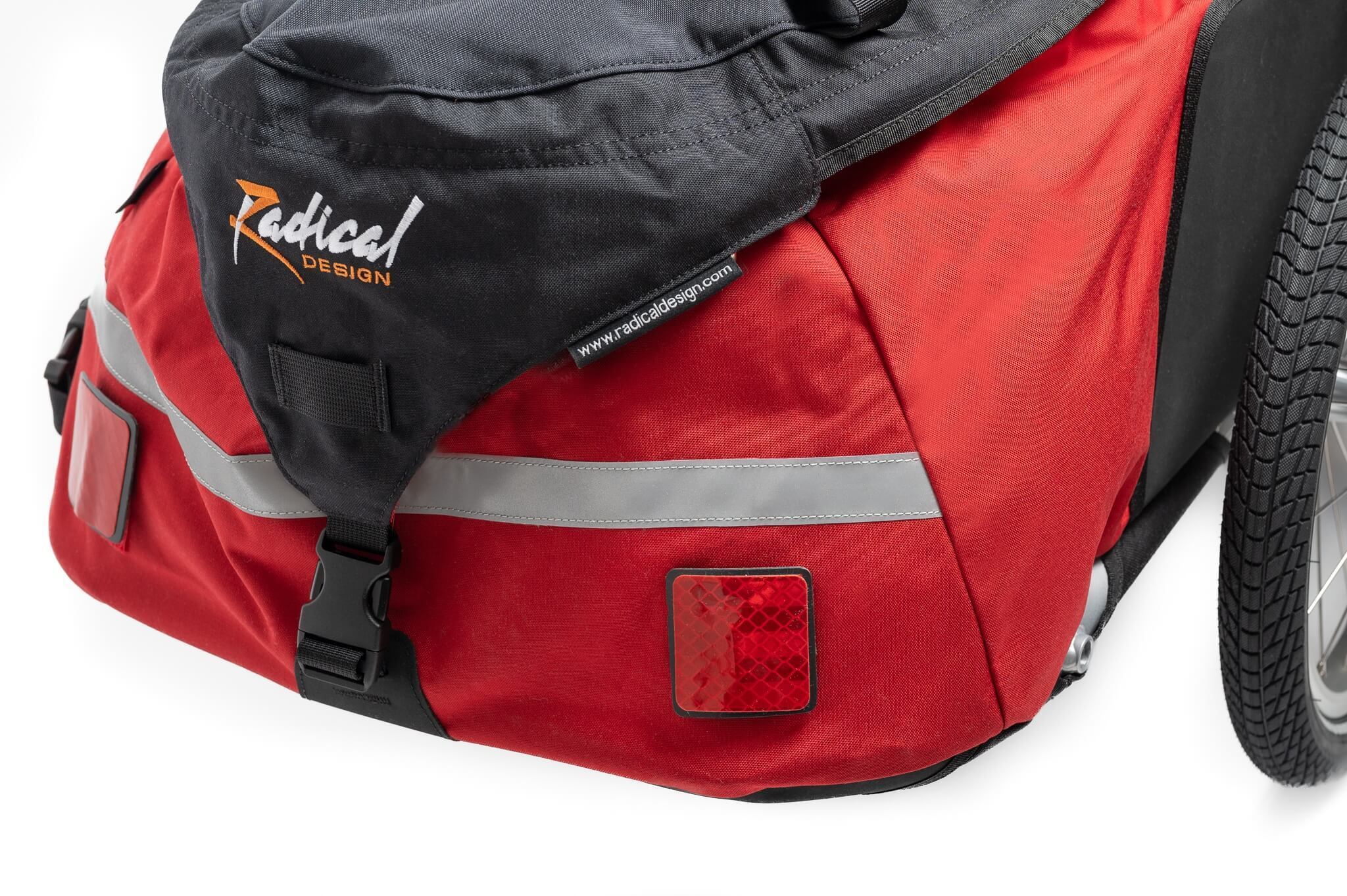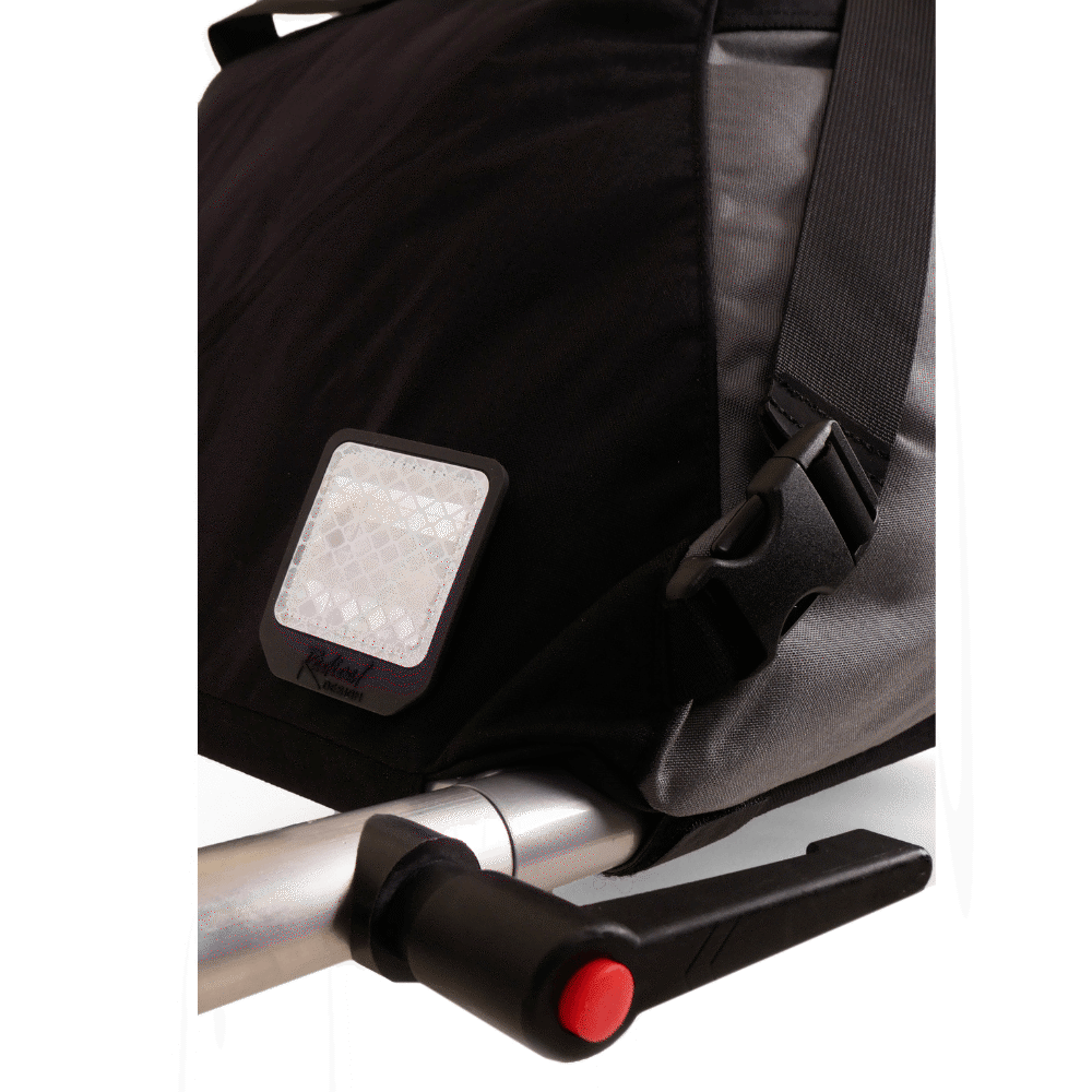 Der standard mitgelieferter Regenüberzug hält den Cyclone IV trocken und schön bei Regen und schmutzigem Spritzwasser. Mit nur 150 Gr. gibt es für dieses kleines Paket immer Platz in der riesigen Cyclone-Tasche. Bei Regen ist er in Sekunden übergezogen und mit Klettband um die Deichsel zu sichern. Viele Cyclone-fahrer nehmen ihn gar nicht mehr ab, weil er die Tasche auch so gut gegen Schmutz schützt.