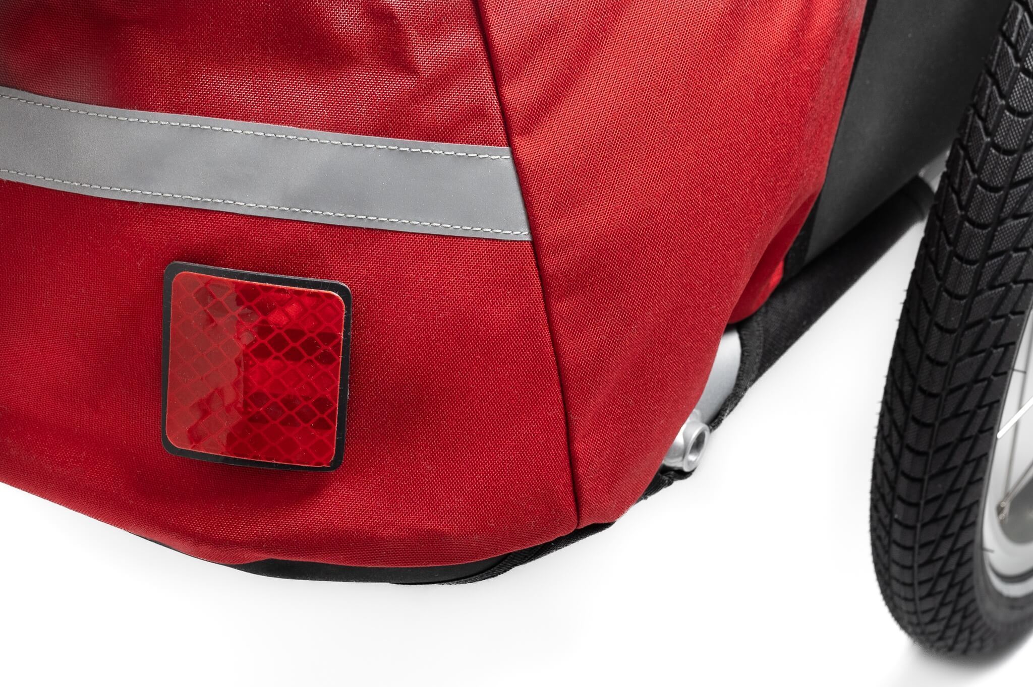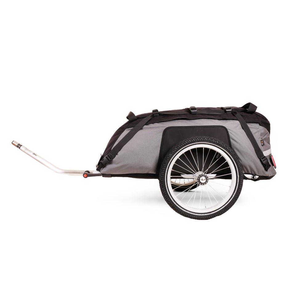 Der Cyclone ist ein Zweirad, wodurch dieser Fahrradanhänger sich selbst ausbalanciert und das Fahrverhalten des Fahrrads nicht beeinträchtigt. Darüber hinaus können Sie in den meisten Fällen das Fahrrad mit dem Anhänger während einer Pause einfach auf den Ständer stellen, ohne dass es umfällt. Durch die Anhängerkupplung an der Nabe bleibt Ihr Gepäckträger weiterhin frei, um Gepäck oder ein Kind zu transportieren.