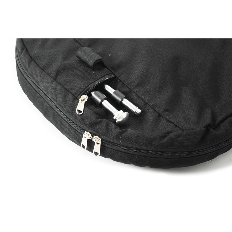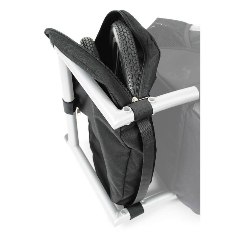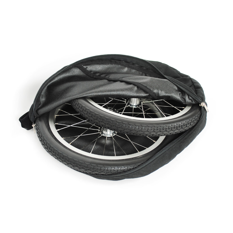 Die Rädertasche schützt die Räder, wenn sie abgenommen sind und schützt die umgebenden Sachen vor den (schmutzigen) Räder. Während der Fahrt ist der Rädertasche natürlich leer und kann als extra Tasche benutzt werden, z. B. für schmutzige oder nasse Sachen.
